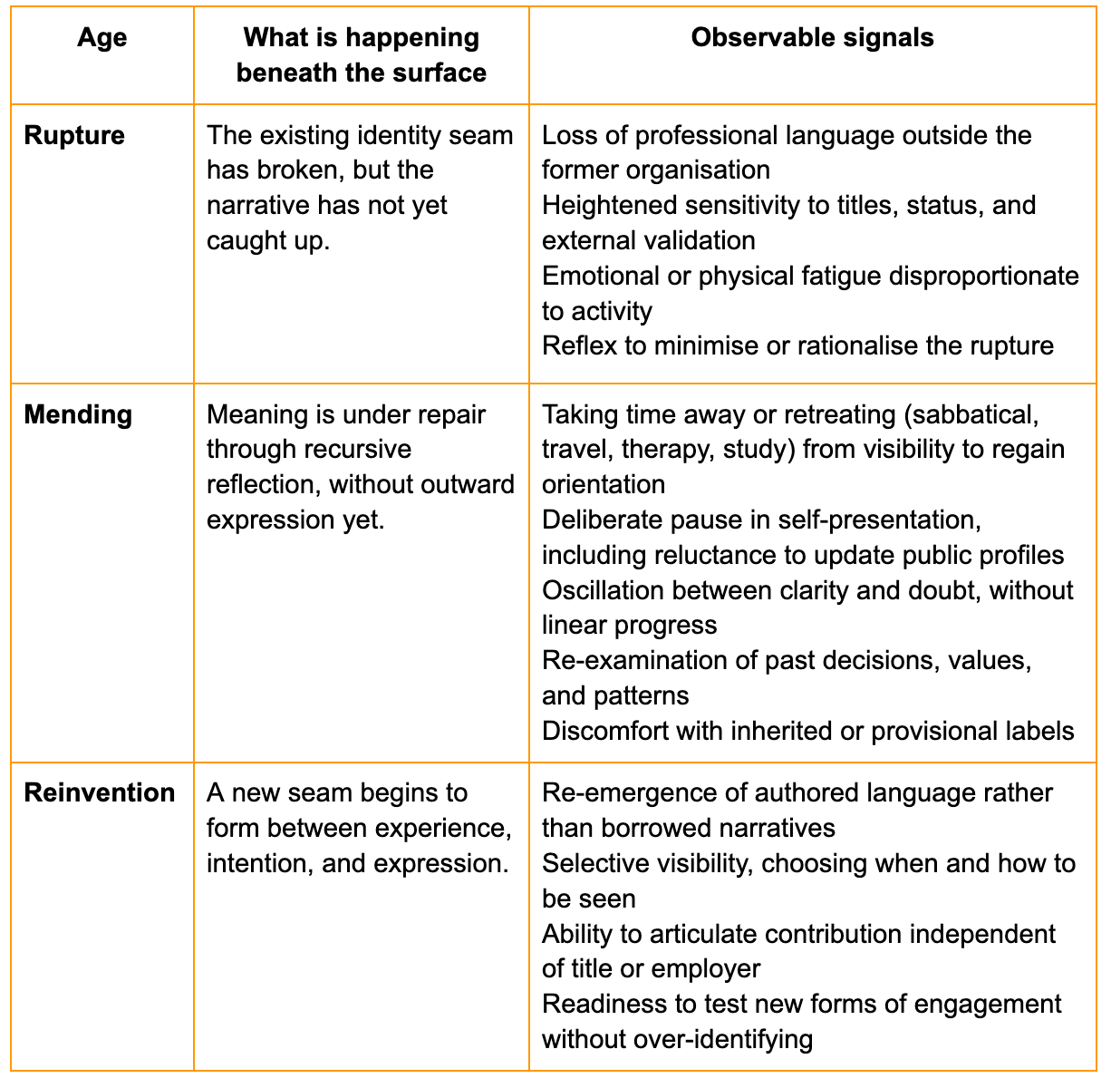 For many senior professionals, meaning has long been externally scaffolded. Title, employer brand, and organisational narrative provide an exoskeleton for coherence, recognition, and direction. Over time, these elements become seamed together into a stable identity. The seam holds as long as lived experience continues to confirm the narrative.